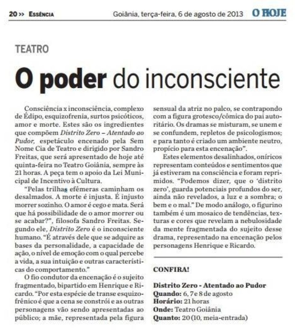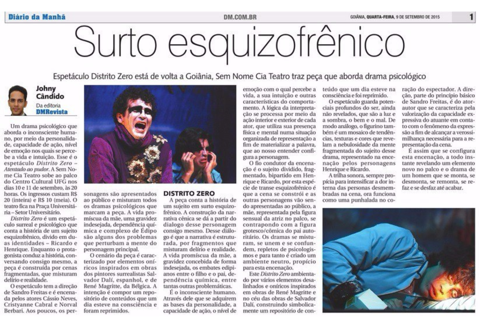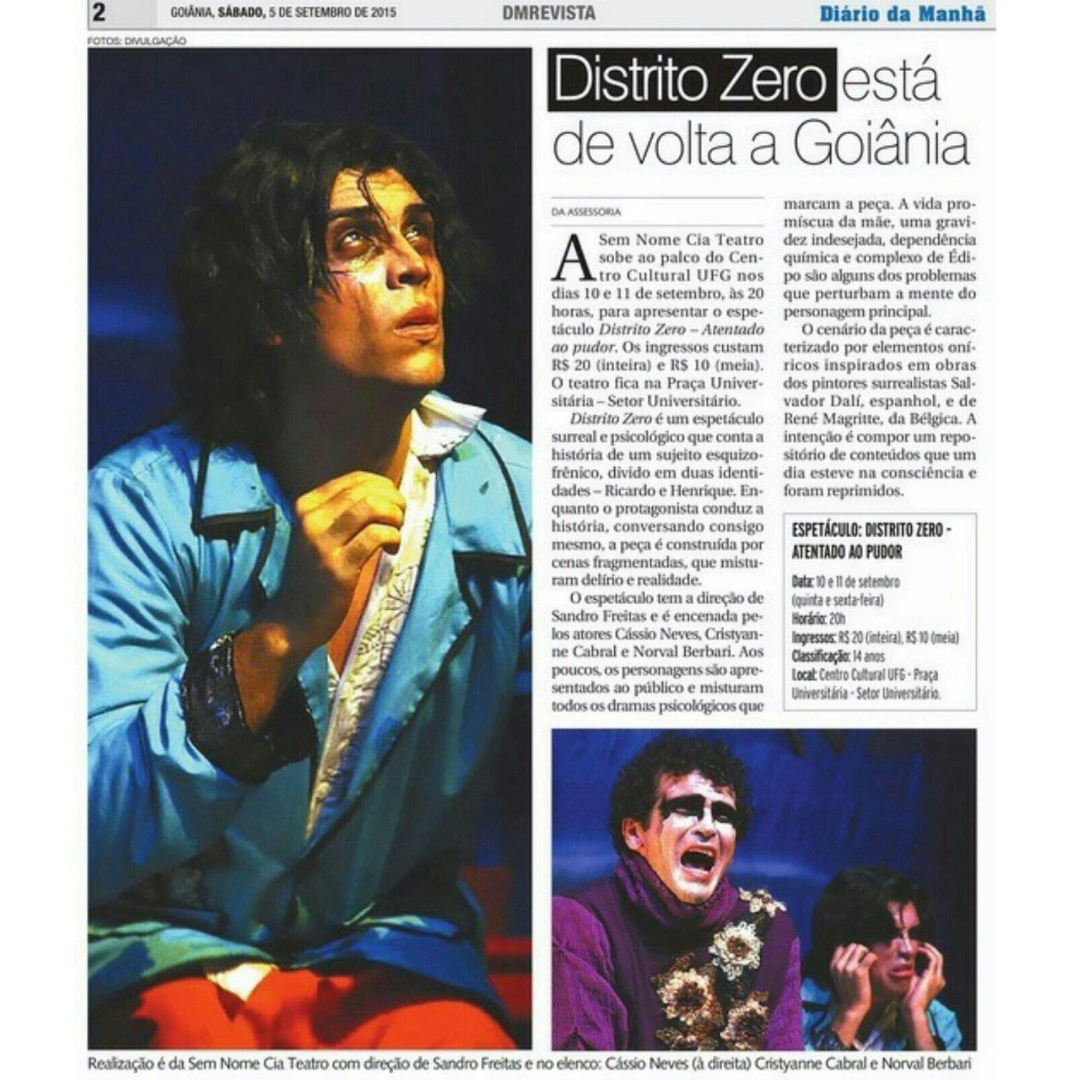 É um espetáculo que estreou em 2013, já realizou 107 sessões em temporadas de circulação em Goiânia; cidades do interior do estado de Goiás; em festivais regionais e nacionais. Distrito Zero é a história de um sujeito em surto esquizofrênico. A construção da narrativa cênica se dá a partir do diálogo da personagem consigo mesma. Desse diálogo é que a história de Ricardo/Henrique vai sendo estruturada, por fragmentos que misturam delírio e realidade: a vida promíscua da mãe e a gravidez concebida de forma indesejada; os embates edipianos entre o filho e o pai; a dependência química; etc. Distrito Zero é o inconsciente humano. Através dele que se adquirem as bases da personalidade, a capacidade de ação, o nível de emoção com o qual percebe a vida, a sua intuição e outras características do comportamento.